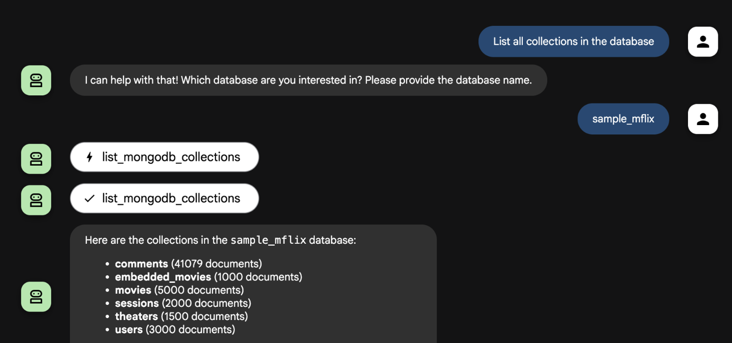 With the secretless_agent now running, it can use the tools defined in its create_agent function. These tools, like list_mongodb_collections, transparently use the dynamic, in-memory MongoDB credentials that were fetched during initialization.