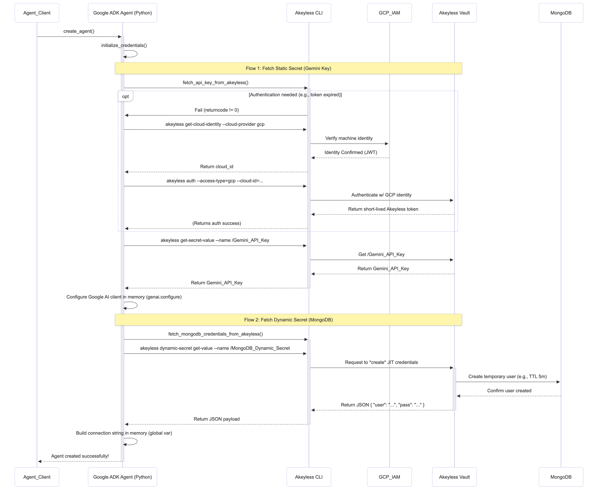 This post explores a more radical, secure architecture: a "dynamic-only" secretless agent. We'll walk through the code for a Google ADK agent that starts with zero credentials. It uses its native GCP cloud identity to fetch its Gemini API key, and for its database, it only accepts just-in-time, dynamic credentials.