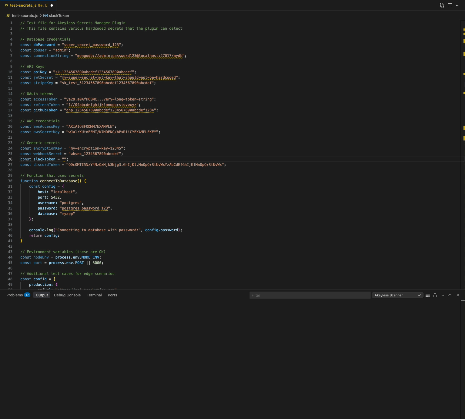 Scan for Secrets Press Ctrl + Shift + P and run “Akeyless: Scan for Hardcoded Secrets”, or simply save the file (Cmd + S) to trigger a scan on the edited file.